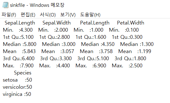- (예) sink('sinkfile.txt')
