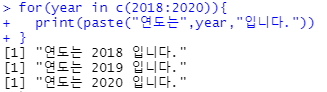 - (예) for(year in c(2018:2020)){