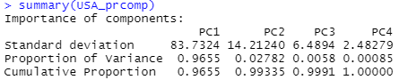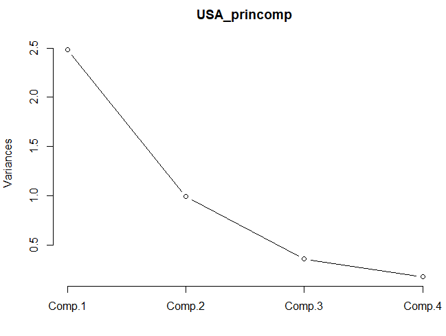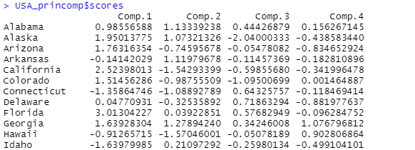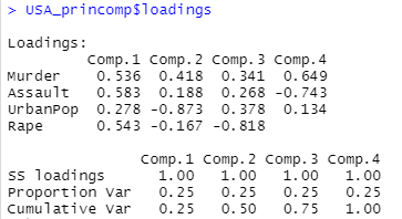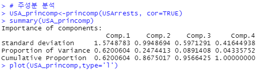 - (예) USA_princomp<-princomp(USArrests, cor=TRUE)