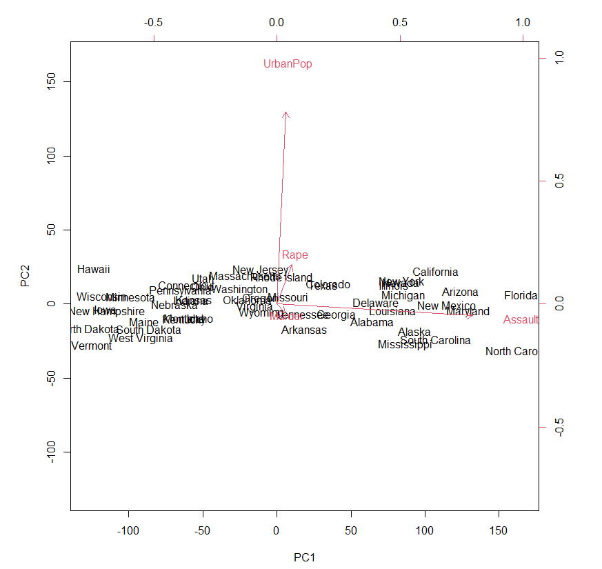 - 여기서 화살표의 방향이 비슷한 변수일수록 서로간의 상관관계가 있다고 판단가능하다. 또한, 상대적 가중치(loadings)가 높을수록 화살표의 방향이 수평에 가까우며 가중치가 낮을수록 화살표의 방향이 x축과 수직에 가깝다(예: UrbanPop).