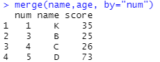 - name, age 두 데이터 프레임이 num 칼럼을 기준으로 병합된 것을 확인할 수 있다.